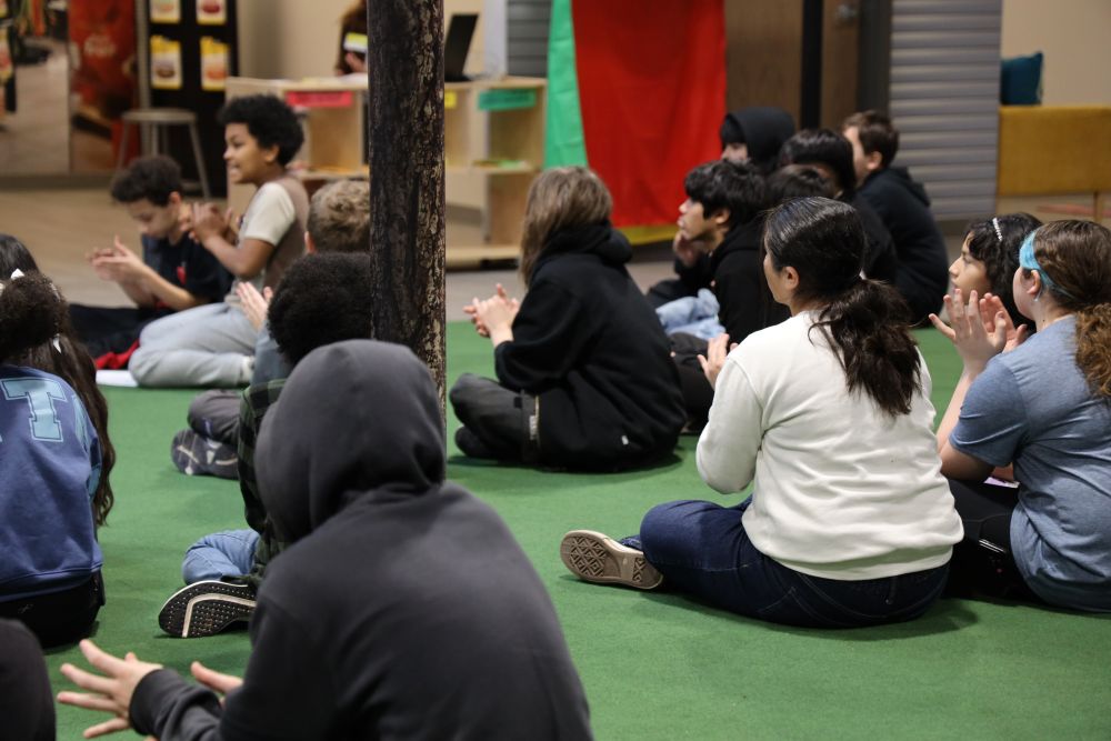 OKLAHOMA CITY (OBV) — At the corner of Love’s Lane and JA BizTown Boulevard, just outside a Love’s-branded storefront, a group of sixth graders sits cross-legged on a green carpet beneath a ceiling dotted with clouds and paper leaves.