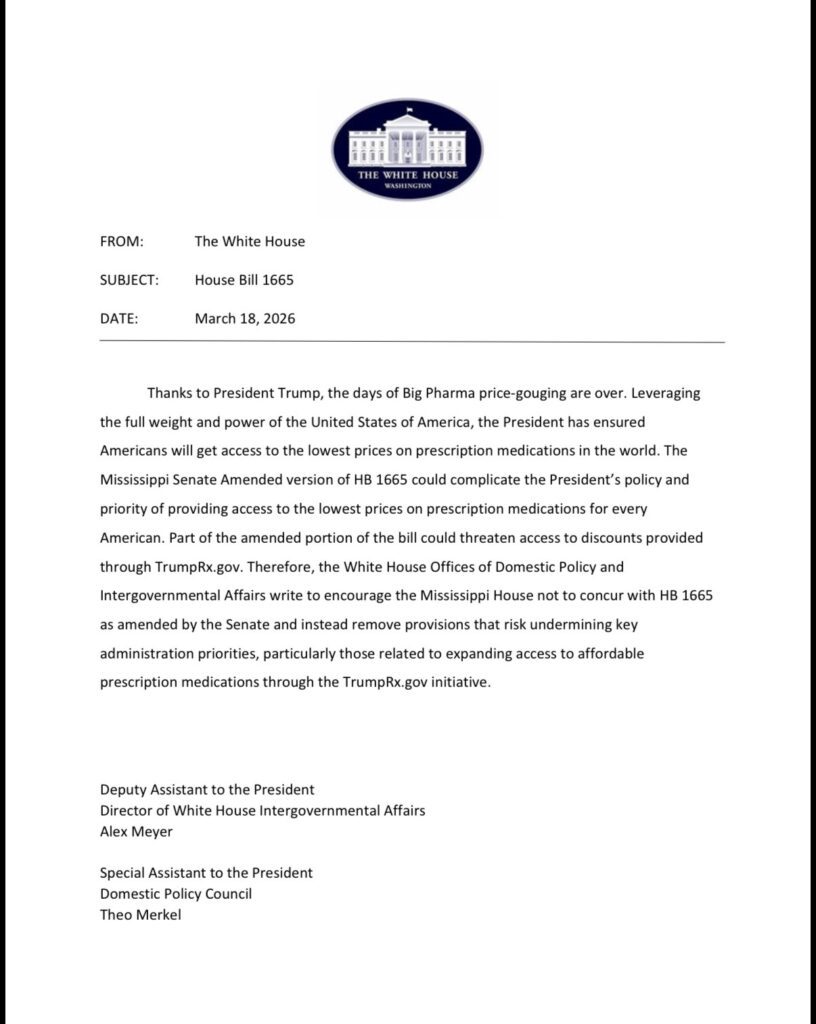 “We … encourage the Mississippi House not to concur with HB 1665 as amended by the Senate and instead remove provisions that risk undermining key administration priorities, particularly those related to expanding access to affordable prescription medications through the TrumpRx.gov initiative,” reads the letter.