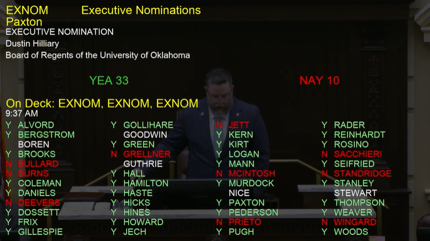 OKLAHOMA CITY (OBV) — The Oklahoma Senate voted Tuesday to confirm Dustin Hilliary to the University of Oklahoma Board of Regents.